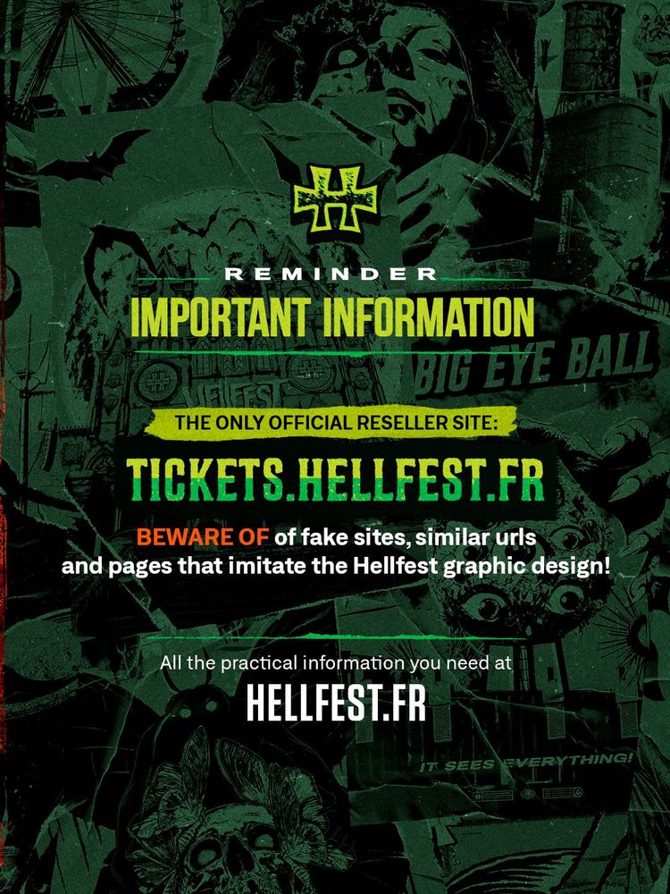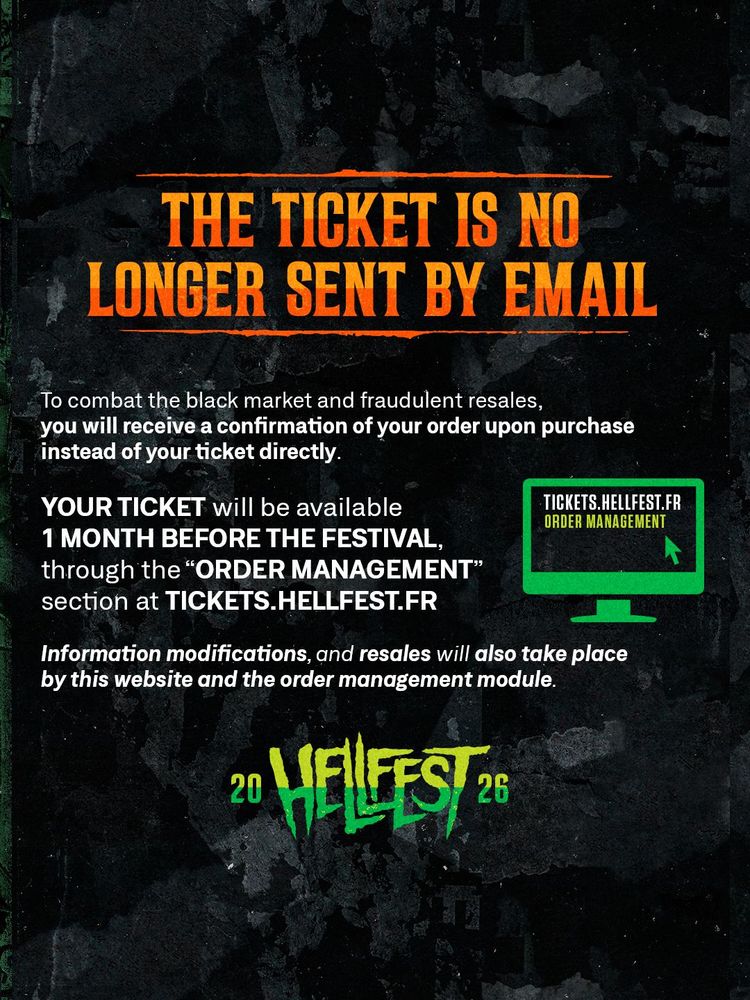 ℹ️ In order to combat the black market, tickets will no longer be sent directly by email. You will receive an order confirmation upon purchase and will be able to find your ticket one month before the festival under “Order Management” at tickets.hellfest.fr